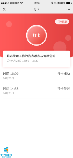 4.打卡規則:若學(xué)員在打卡點(diǎn)X公里內,點(diǎn)擊打卡則可以打卡成功,并顯示當前打卡時(shí)間、日期,若在規定范圍外可顯示打卡失敗